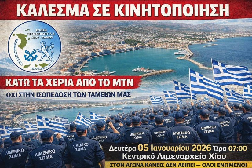 Η Ένωση Προσωπικού Λιμενικού Σώματος Χίου – Σάμου ενημερώνει ότι τη Δευτέρα 5 Ιανουαρίου 2026 στις 07:00 π.μ. θα πραγματοποιηθεί κινητοποίηση διαμαρτυρίας έξω από το Κεντρικό Λιμεναρχείο Χίου.
