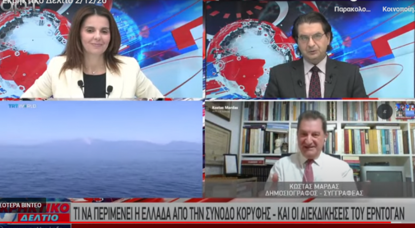 «Και μόνο ότι το Ορούτς Ρέιτς έκανε έρευνες επί 78 ημέρες, ότι το καλοκαίρι ο Ερντογάν απείλησε με πόλεμο την Ελλάδα, ότι απείλησε να χτυπήσει το αεροπλανοφόρο αν παρεμπόδιζε το Ορούτς Ρέις και ότι το Μπαρμπαρός έχει πραγματοποιήσει έρευνες σε 200.000 τετραγωνικά χιλιόμετρα… υποτιθέμενης ευρωπαϊκής – κυπριακής ΑΟΖ και στην Ευρωπαϊκή Ένωση το σκέπτονται να πάρουν μέτρα, δείχνει ότι ούτε οι Ευρωπαίοι, ούτε οι Αμερικάνοι θέλουν να έρθουν σε ρήξη με την Τουρκία. Ειδικά που στις 10 Δεκεμβρίου ο Ερντογάν θα ανακοινώσει μέτρα εκδημοκρατισμού, τα οποία μπορεί και να τους αφήσουν… άφωνους, ρίχνοντας το μπαλάκι σε μας!».