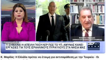 Αυτά τα ερωτήματα διερεύνησε ο Κώστας Μαρδάς , μιλώντας στο δελτίο ειδήσεων του BLUE SKY με την Άντζυ Σταθάτου ( 1 /9), επισημαίνοντας την άσκηση υπό την κωδική ονομασία «Ευνομία», που θα διεξαχθεί στις 15 Σεπτεμβρίου στην επίμαχη περιοχή μεταξύ Ρόδου και Κύπρου.