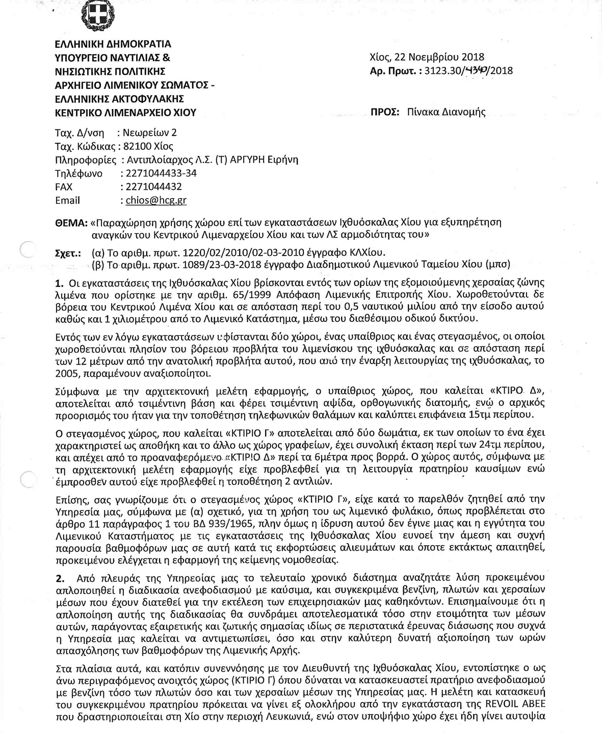 ΘΕΜΑ: «Παραχώρηση χρήσης χώρου επί των εγκαταστάσεων Ιχθυόσκαλας Χίου για εξυπηρέτηση αναγκών του Κεντρικού Λιμεναρχείου Χίου και των Λ.Σ. αρμοδιότητάς του»