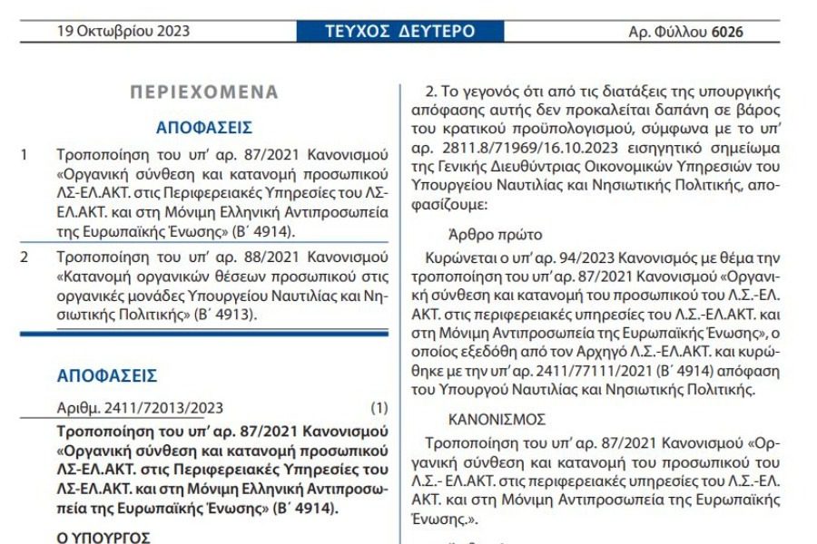 Ερωτηματικά έχει προκαλέσει η απόφαση του Υπουργείου Ναυτιλίας και Νησιωτικής Πολιτικής για μείωση των οργανικών θέσεων στις Λιμενικές αρχές της Λέσβου, της Χίου και της Σάμου. Συγκεκριμένα, όπως αναφέρει σε δημοσίευμά της η ιστοσελίδα της Λέσβου stonisi, με το νέο Κανονισμό «Οργανική σύνθεση και κατανομή του προσωπικού του Λ.Σ.-ΕΛ.ΑΚΤ. στις περιφερειακές υπηρεσίες του Λ.Σ.-ΕΛ.ΑΚΤ…» (Β’ 6026/19-10-2023), στον οποίο γίνεται η κατανομή των οργανικών θέσεων, προβλέπονται 31 λιγότερες θέσεις για τη Μυτιλήνη, 6 θέσεις λιγότερες για τη Μήθυμνα, 10 για τη Χίο, 29 στη Σάμο και 5 στη Μύρινα.