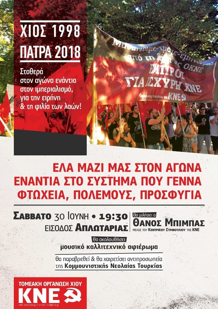 Η εκδήλωση, που θα πραγματοποιηθεί το Σάββατο 30 Ιούνη στην είσοδο της απλωταριάς στις 19:30, πραγματοποιείται 20 ολόκληρα χρόνια μετά, όταν η Χίος είχε επιλεχθεί από την ΚΝΕ και το ΚΚΕ για το 7ο Αντιϊμπεριαλιστικό διήμερο της οργάνωσης στις 4 και 5 Ιούλη του 1998.