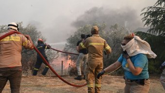 Στην περιοχή επικρατεί πανικός, ακούγονται και νέες εκρήξεις, ενώ τις πρώτες είδαν οι εθελοντές που από θαλάσσης κατευθύνονται στην Κριθαριά για να παραλάβουν πολίτες.