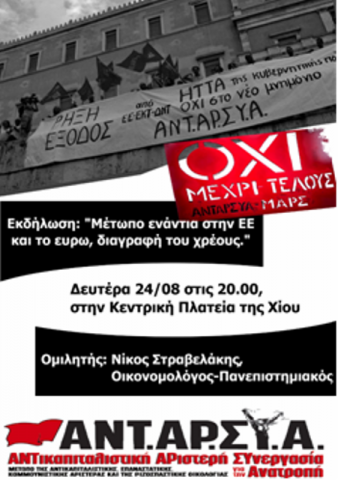 Ομιλία με θέμα «Μέτωπο ενάντια στην Ευρωπαϊκή Ένωση και το ευρώ – Διαγραφή του χρέους» και ομιλητή τον Οικονομολόγο και Πανεπιστημιακό Νίκο Στραβελάκη, θα πραγματοποιήσει τη Δευτέρα 24 Αυγούστου στην πλατεία Βουνακίου, η Τοπική Επιτροπή της ΑΝΤΑΡΣΥΑ.