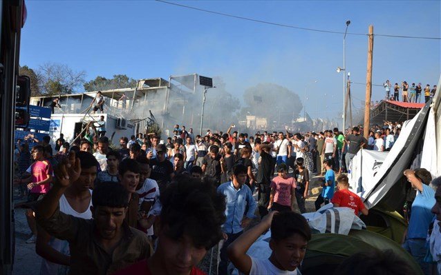 Η απανθρακωμένη σορός μιας γυναίκας, που μεταφέρθηκε από ιδιώτη στο Νοσοκομείο Μυτιλήνης, και το πτώμα ενός απανθρακωμένου παιδιού, που έβγαλαν μέσα σε μια κουβέρτα πρόσφυγες και μετανάστες από το τμήμα του καταυλισμού που κάηκε στην κάτω πύλη του Κέντρου Υποδοχής και Ταυτοποίησης (ΚΥΤ), αλλά και τουλάχιστον πέντε τραυματίες, είναι ο μέχρι στιγμής απολογισμός όσων διαδραματίζονται στον καταυλισμό της Μόριας από τις 5 το απόγευμα της Κυριακής.