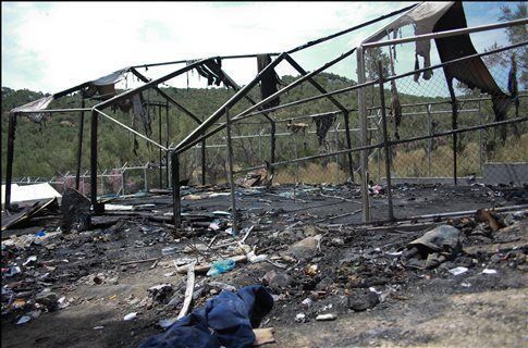 Περιμένοντας την επίσκεψη του Γ.Γ. του ΟΗΕ... ένα κοντέινερ στο hot spot της Μόρια, στη Λέσβο έκαψαν το βράδυ της Παρασκευής πρόσφυγες από την Αλγερία.