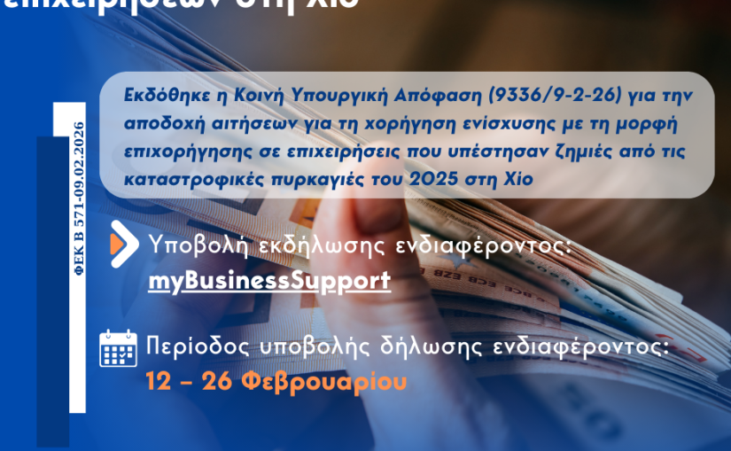 Δημοσιεύθηκε στο ΦΕΚ (Β’ 571) η υπ’ αριθμ. 9336/9-2-26 Κοινή Υπουργική Απόφαση για τη χορήγηση ενίσχυσης με τη μορφή επιχορήγησης σε επιχειρήσεις που υπέστησαν ζημιές από τις καταστροφικές πυρκαγιές του 2025 στη Χίο.