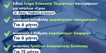 Στηρίζουμε τις πληγείσες επιχειρήσεις μέσω Ειδικού Σχήματος Ενίσχυσης Τουριστικών Επιχειρήσεων για την απώλεια τζίρου σε δύο φάσεις. Τώρα, κατά την Α’ φάση μπορούν να υποβάλλουν αιτήσεις και στη Β’ φάση θα καθοριστούν οι παράμετροι του προγράμματος. Παράλληλα, ενεργοποιήθηκε η αναστολή φορολογικών υποχρεώσεων και η αναστολή και ρύθμιση ασφαλιστικών εισφορών για έξι μήνες, καθώς και η αναστολή πράξεων αναγκαστικής εκτέλεσης για δώδεκα μήνες, για κατοίκους και επιχειρήσεις που έχουν υποστεί ζημιές.