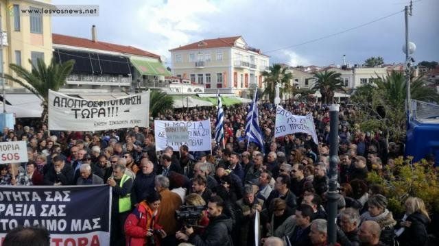 Με ψήφισμα της συγκέντρωσης εκφράζεται «η αγανάκτησή των συγκεντρωμένων για την πολιτική που ακολουθείται και εφαρμόζεται από την Ευρωπαϊκή Ένωσης και την Ελληνική Κυβέρνηση στο προσφυγικό – μεταναστευτικό και η οποία μετατρέπει τη Λέσβο από νησί του πολιτισμού και της Δημοκρατίας σε νησί φυλακή»