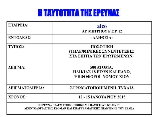 Όσον αφορά σχόλια και υπαινιγμούς για την εγκυρότητά της, επισημαίνεται ότι η «ΑΛΗΘΕΙΑ» απευθύνθηκε στην εταιρεία ALCO για την διενέργεια της δημοσκόπησης, καθώς η τελευταία δημοσιευμένη έρευνα της Alco πριν τις εκλογές του 2012, ήταν στην εφημερίδα «ΠΡΩΤΟ ΘΕΜΑ», και έδινε 25,6% στη ΝΔ και 22,9 στον ΣΥΡΙΖΑ. Δηλαδή διαφορά 2,7% που επιβεβαιώθηκε πλήρως, αφού η διαφορά στις εκλογές ήταν 2,77%. Επίσης στις πρόσφατες Ευρωεκλογές, η τελευταία δημοσκόπηση δημοσιοποιήθηκε στο «ΠΡΩΤΟΘΕΜΑ.GR» την Παρασκευή πριν τις εκλογές και έδινε στον ΣΥΡΙΖΑ 24,2% και στη ΝΔ 20,8%. Δηλαδή διαφορά 3,8% που επίσης επιβεβαιώθηκε πλήρως αφού η διαφορά στις Ευρωεκλογές ήταν 3,85%.