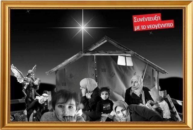 Με τη μεσολάβηση της Ύπατης Αρμοστείας του ΟΗΕ, συναντήσαμε τον πρόσφυγα Ιησού Χριστό, ο οποίος φέτος γεννήθηκε στη Σούδα της ακριτικής μας Χίου. Τον βρήκαμε μέσα σε μια σκηνή να κρυώνει, να τουρτουρίζει, να βήχει, να ξεπαγιάζει, ανάμεσα σε λάσπες, νερά και τον αέρα να λυσσομανά, ενώ ο Ιωσήφ από το Κανταχάρ πάσχιζε να κλείσει τις τρύπες από το κατάλυμα και η Μαρία από το Χαλέπι να τον σφίγγει στην αγκαλιά ζεσταίνοντάς τον με τα χνώτα της.