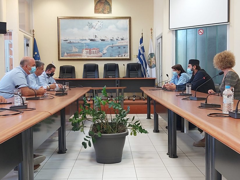 Προβλήματα και λειτουργικά θέματα της "Κιβωτού Αιγαίου" συζητήθηκαν σήμερα στο Δημαρχείο, παρουσία του πατ. Αντωνίου Παπανικολάου, με την συμμετοχή του υπουργού Μετανάστευσης Νότη Μηταράκη και του Δημάρου Χίου Σταμάτη Κάρμαντζη