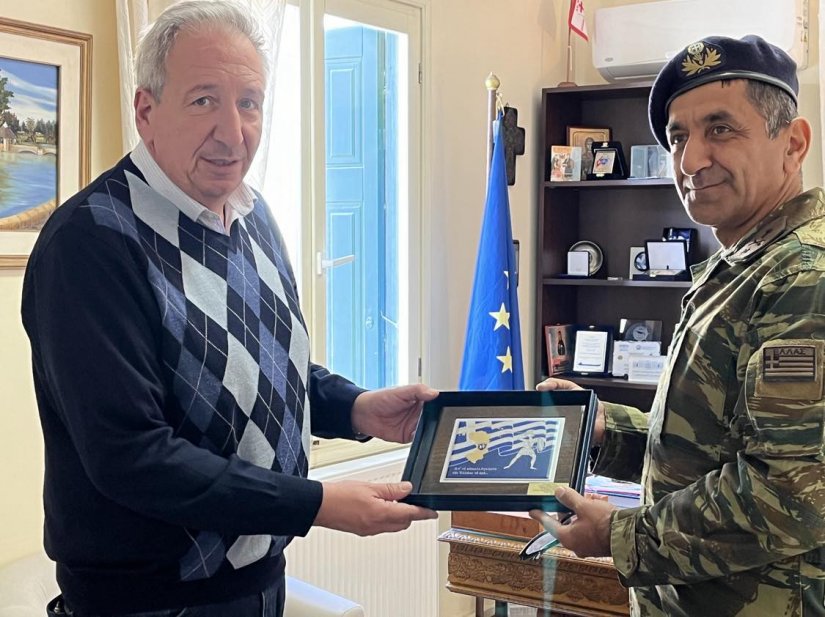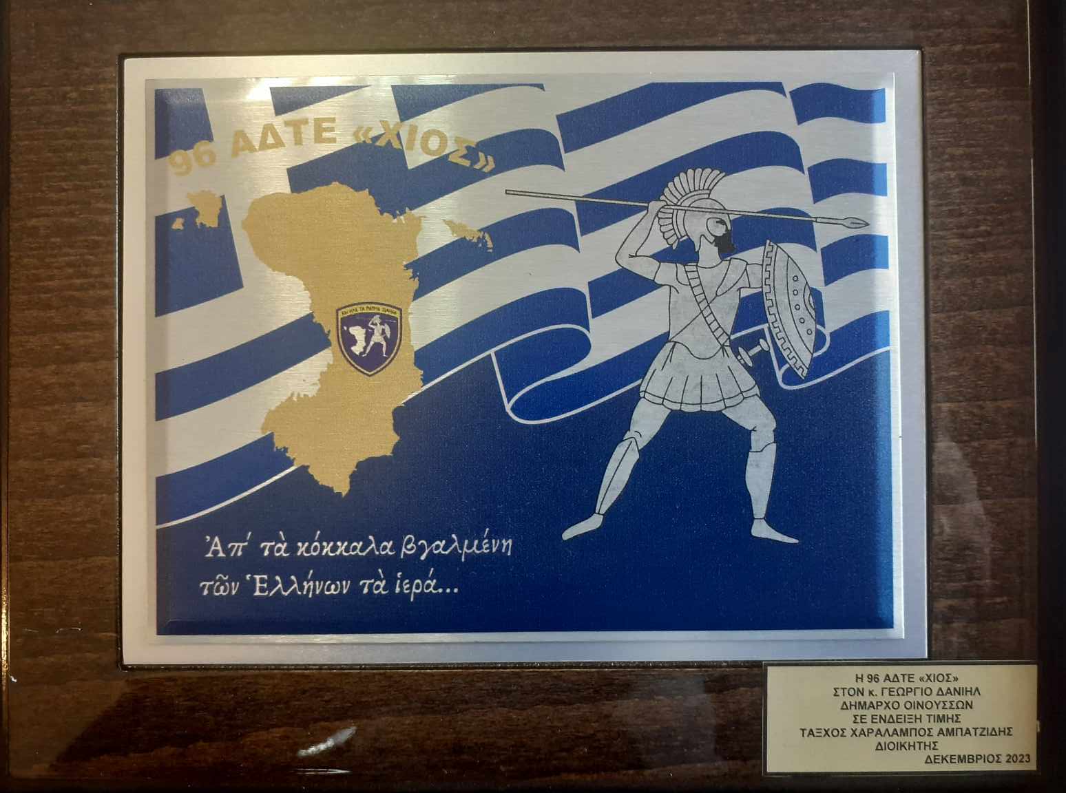 "Με την ευκαιρία της σημερινής επίσκεψης του Διοικητή 96ΑΔΤΕ "Χίος" Ταξίαρχου κ. Χαράλαμπου Αμπατζίδη στα Ε/Φ Οινουσσών και Παναγιάς, είχα την ξεχωριστή τιμή κι ιδιαίτερη χαρά να τον καλωσορίσω στο Δημαρχείο στην πρώτη επίσκεψη του μετά την πρόσφατη ορκωμοσία μας! Ευχαριστώ ευγνωμόνως τον αγαπητό φίλο κ. Ταξίαρχο για τις ευχές και για την τιμητική πλακέτα, που μου επέδωσε. Με την Γαλανόλευκη και τη β' στροφή του Εθνικού Υμνου, δώρο συμβολικό κι επίκαιρο, επιβεβαιώθηκε η αδιατάρακτη στήριξή μας στο έργο των ΕΔ και η παραγωγική συνεργασία μας για την επαύξηση του αισθήματος ασφαλείας των ακριτών μας."