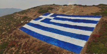 Μια τεράστια ελληνική σημαία, με βαμμένες μπλέ και άσπρες τις πέτρες των Οινουσσών.