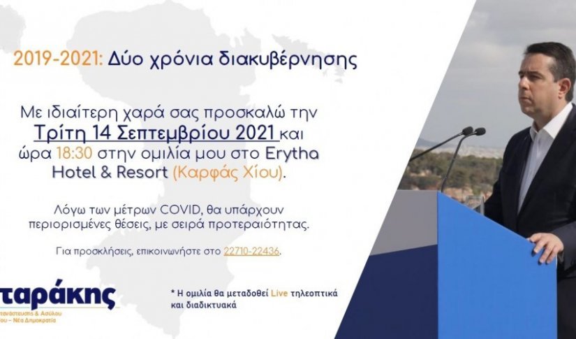 «Με ιδιαίτερη χαρά σας προσκαλώ στην εκδήλωσή μου με θέμα "2019-2021: Δύο χρόνια διακυβέρνησης", την Τρίτη 14 Σεπτεμβρίου και ώρα 6.30 μ.μ. στο Erytha Hotel & Resort, στον Καρφά της Χίου. Θα χαρώ μετά από καιρό να συναντηθούμε από κοντά και να ανταλλάξουμε απόψεις» σημειώνει στην σχετική λιτή πρόσκληση, που έχει ήδη αποσταλεί.