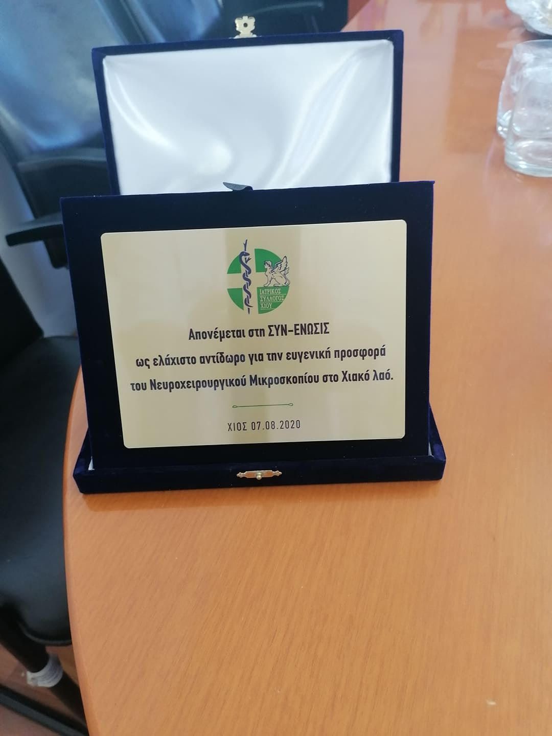 Ο Ιατρικός Σύλλογος Χίου εκφράζει με ανακοίνωση του την ευγνωμοσύνη του, στην Εταιρεία Κοινωνικής Προσφοράς Ελληνικού Εφοπλισμού ΣΥΝ-ΕΝΩΣΙΣ για την δωρεά του νευροχειρουργικού μικροσκοπίου. Πρόκειται για μια δωρεά ζωής που επιτεύχθηκε μετά από πρωτοβουλία του Ι.Σ. Χίου και θα συμβάλει στην αναβάθμιση των υπηρεσιών υγείας για τους κατοίκους του νησιού.