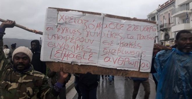 Oι μετανάστες οι οποίοι ζητούν τον άμεσο απεγκλωβισμό τους από το νησί, κρατούσαν πλακάτ, στα οποία αναγράφονταν φράσεις όπως “Χρειαζόμαστε ελευθερία, οι έγκυες γυναίκες, τα παιδιά υποφέρουν σε κακές συνθήκες διαβίωσης. Είμαστε άνθρωποι».
