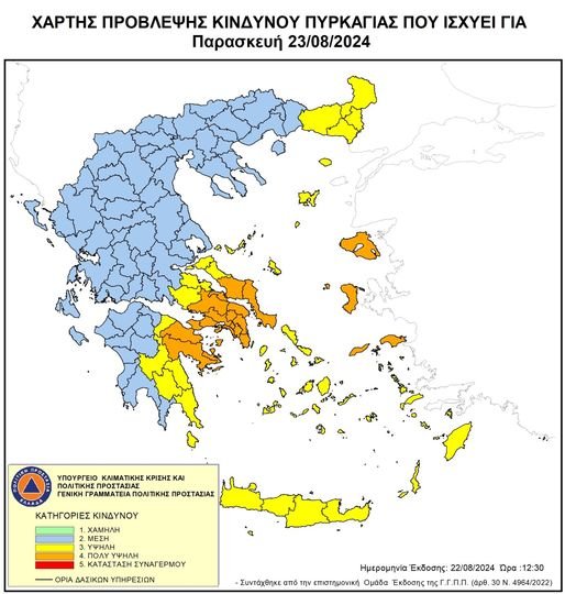 ΠΡΟΣΟΧΗ! Αύριο Παρασκευή 23.08.2024 σύμφωνα με τους χάρτες της Πολιτικής Προστασίας υπάρχει πολύ ισχυρή επικινδυνότητα για πρόκληση πυρκαγιάς (κατηγ. 4). στην περιοχή του Β. Αιγαίου.