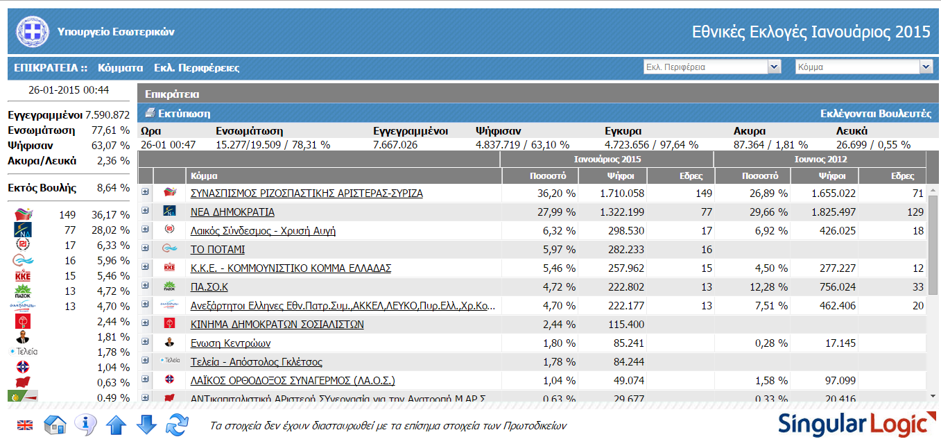 Ενώ τα αποτελέσματα θα έχουν ενδιαφέρον μέχρι το τέλος, ο νικητής Σύριζα δεν αποσπά την αυτοδυναμία σε πανελλαδικό επίπεδο κερδίζοντας 149 έδρες, το Βόρειο Αιγάιο βάφεται ροζ και η Χίος μπλέ. με καταμετρημένι το 80% των εκλογικών τμημάτων τα αποτελέσματα έχουν ως εξής: