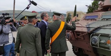 Ο πρωθυπουργός μετά την ομιλία στην Απλωταριά πήγε στο στρατόπεδο Γκιάλα όπου παρέστη στον επίσημο εορτασμό του προστάτη του Στρατού Ξηράς Αγίου Γεωργίου, παρουσία του Μητροπολίτη Χίου-Ψαρών-Οινουσσών κ. Μάρκου αλλά και του αρχηγού ΓΕΕΘΑ, Στρατηγού κ. Δημητρίου Χούπη, ο οποίος, μαζί με τον Ταξίαρχο, Διοικητή της 96 ΑΔΤΕ, Χαράλαμπο Αμπατζίδη τον συνόδεψαν στην περιήγησή του στα διάφορα οπλικά συστήματα που εκτίθεντο στην Ταξιαρχία.