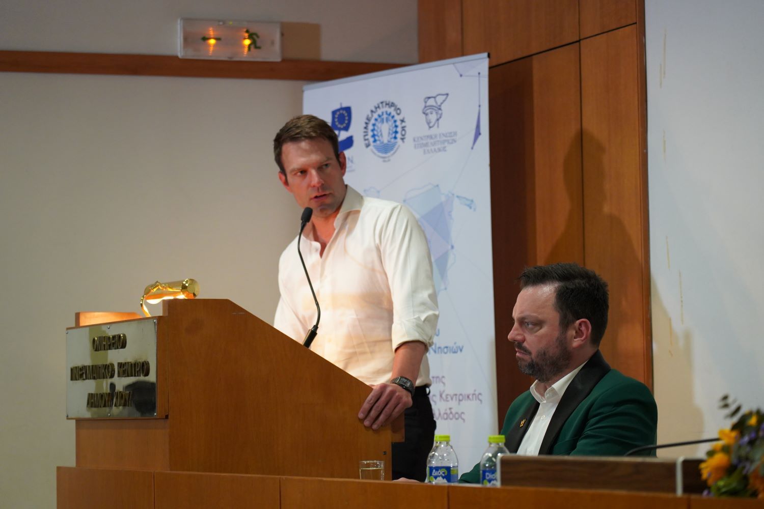 Στη συνέχεια μετέβη στο Ομήρειο, στην γενική συνέλευση των νησιωτικών επιμελητηρίων όπου απεύθυνε χαιρετισμό εστιάζοντας στα προβλήματα των νησιών έτσι όπως τα  βίωσε κατά τη διάρκεια της περιοδείας του.