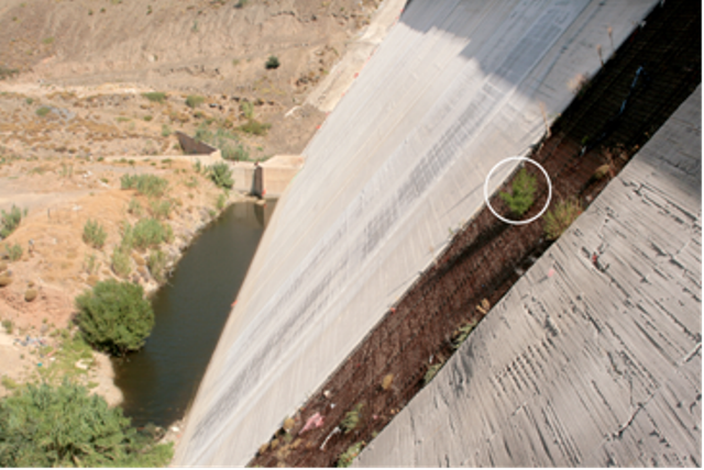 Σήµερα, 12 Σεπτεµβρίου 2017, είδα στην αυτή θέση της δυτικής πλευράς του φράγµατος «Στης Κόρης το Γεφύρι» την ίδια λωρίδα σίδερα σκυροδέµατος ακόµη τόσα χρόνια ακάλυπτη από τσιµέντο. Προς επίρρωση αυτών που γράφω, στο κέντρο της λωρίδας φύτρωσε µεσ’ τα σίδερα θαλερός πεύκος ύψους 1,5 µ. (στη φώτο το κυκλάκι) και λίγο πιο κάτω αναπτύχθηκαν πάµπολλοι θάµνοι µέχρι τα θεµέλια. Η εικόνα προοιωνίζει τη µετατροπή του φράγµατος σε ερείπια.