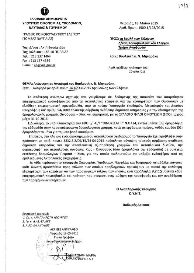Αυτό προκύπτει από την απάντηση που έλαβε από τον υπουργό, Θ. Δρίτσα, ο Βουλευτής Χίου, Νότης Μηταράκης, σε σχετική αναφορά του για την ακτοπλοϊκή σύνδεση του λιμένος Οινουσσών με τον Πειραιά.