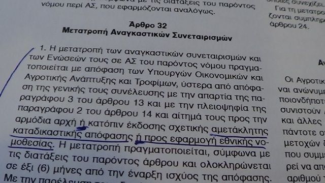 Επειδή τώρα στους Νόμους ακόμα και η τοποθέτηση ενός κόμματος στη φράση έχει σημασία, το επίμαχο άρθρο 32 του Νόμου, που αναφέρεται στην μετατροπή Αναγκαστικών Συνεταιρισμών, την οποια σημειώνουμε... μετατροπή ουδείς ζήτησε... φανερά αναφέρονται: Η μετατροπή κ.λ.π. γίνεται με απόφαση των υπουργών Οικονομικών και Αγροτικής ανάπτυξης, ύστερα από απόφαση της γενικής συνέλευσης των παραγωγών "ή κατόπιν έκδοσης σχετικής αμετάκλητης καταδικαστικής απόφασης ή προς εφαρμογή εθνικής νομοθεσίας"