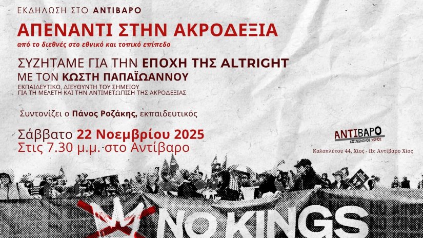Το Αντίβαρο οργανώνει συζήτηση για την παγκόσμια άνοδο της ακροδεξιάς, το προσεχές Σάββατο 22 Νοεμβρίου στις 7.30 μ.μ., με καλεσμένο τον Κωστή Παπαϊωάννου.