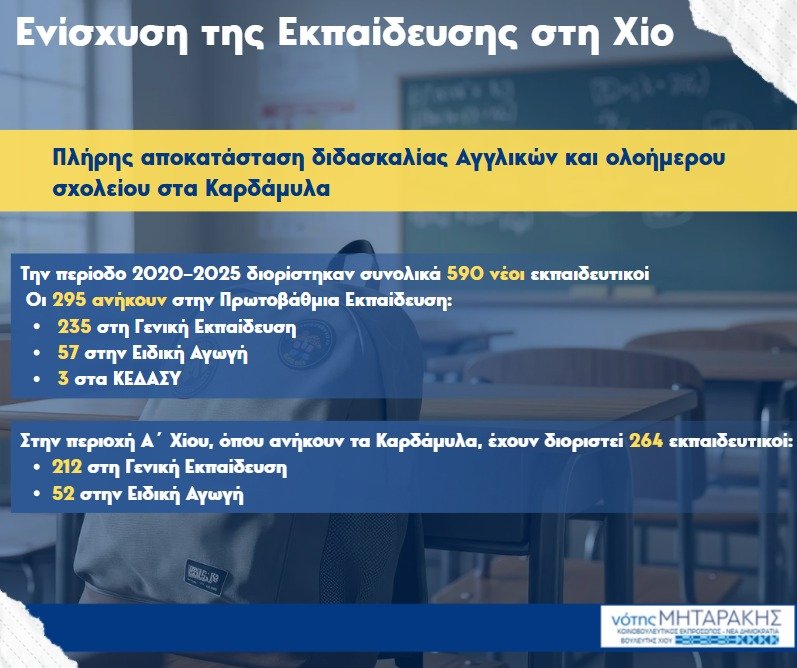 Σύμφωνα με στοιχεία του Υπουργείου Παιδείας και Θρησκευμάτων, όπως αναφέρει δελτίο Τύπου από το γραφείο του Βουλευτή, "την περίοδο 2020-2025 έχουν διοριστεί στη Χίο 590 νέοι εκπαιδευτικοί, εκ των οποίων 295 στην Πρωτοβάθμια Εκπαίδευση, 235 στη Γενική Εκπαίδευση, 57 στην Ειδική Αγωγή και 3 στα ΚΕΔΑΣΥ, ενισχύοντας σημαντικά τη στελέχωση των σχολικών μονάδων και διασφαλίζοντας την ομαλή λειτουργία τους. Πιο συγκεκριμένα, στην περιοχή της Α΄ Χίου, όπου ανήκουν τα Καρδάμυλα, έχουν διοριστεί 264 εκπαιδευτικοί, εκ των οποίων 212 στην Γενική Εκπαίδευση και 52 στην Ειδική Αγωγή. Στα ανωτέρω στοιχεία δε συμπεριλαμβάνονται οι αναπληρωτές που έχουν διοριστεί κατά το έτος 2025".