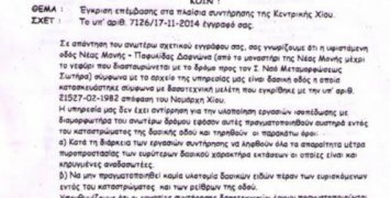 «Με τρόπο εντελώς απαράδεκτο ο Δ/ντής Δασών Χίου κ. Κ. Μπέλλας προσπαθεί με δημόσια ανακοίνωσή του να αποποιηθεί των σοβαρότατων ευθυνών του και να παραπληροφορήσει τους πολίτες της Χίου, ισχυριζόμενος ψευδώς ότι για την αποκατάσταση της οδού Νέας Μονής – Παφυλίδας Δαφνώνα δεν είχε λάβει ποτέ αίτημα για έγκριση επέμβασης από την Περιφερειακή Ενότητα Χίου.