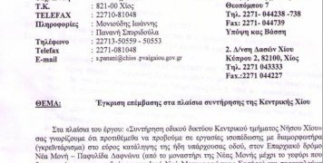 - Σε απάντηση του προαναφερόμενου εγγράφου μας, η Δ/νση Δασών Χίου με το υπ΄ αριθμ. Πρωτ. 20339/24-03-2015 έγγραφό της ζητούσε το υπ΄ αριθ. Πρωτ. 10129/38/17-02-2015Η έγγραφο της Γενικής Δ/νσης Αναπτυξιακού Προγραμματισμού-Περιβ/ντος και Υποδομών Περιφέρειας Βορείου Αιγαίου, (το οποίο ήδη της είχαμε αποστείλει με το με αρ. Πρωτ. 1552/06-03-2015 έγγραφό μας), την απαλλαγή της περιβαλλοντικής αδειοδότησης του έργου, καθώς και το Πρακτικό της Ιεράς Νέας Μονής περί συναίνεσης καθώς δεν την ικανοποιούσε το έγγραφο της Ιεράς Μητρόπολης Χίου.