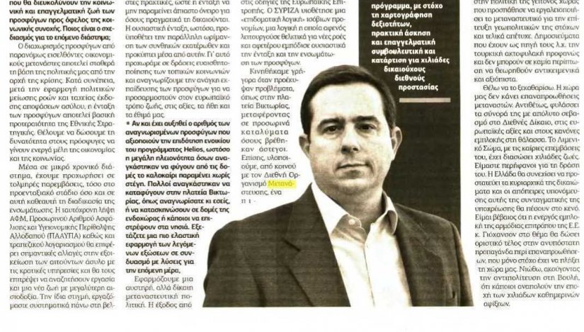Αυτά ανέφερε σε συνέντευξη του στην Εφημερίδα των συντακτών ο υπουργός Μετανάστευσης Νότης Μηταράκης. Αναλυτικά τόνισε: Μέσα σε μικρό χρονικό διάστημα, έχουμε προχωρήσει σε τολμηρές παρεμβάσεις, τόσο στο προ-ενταξιακό στάδιο, όσο και στην αυτή καθαυτή διαδικασία της ενσωμάτωσης. Η ταυτόχρονη λήψη ΑΦΜ, Προσωρινού Αριθμού Ασφάλισης και Υγειονομικής Περίθαλψης Αλλοδαπού (ΠΑΑΥΠΑ), καθώς και τραπεζικού λογαριασμού θα επιφέρει σημαντικές αλλαγές στην εξοικείωση των αιτούντων άσυλο με τις κρατικές υπηρεσίες και θα τους επιτρέψει να αναζητήσει εργασία και μια νέα ζωή με μεγαλύτερη αισιοδοξία. Την ίδια στιγμή, εργαζόμαστε συστηματικά πάνω στην βελτίωση του προγράμματος “Helios”. Σχεδιάζουμε ένα νέο πιλοτικό πρόγραμμα, με στόχο τη χαρτογράφηση δεξιοτήτων, πρακτική άσκηση και επαγγελματική συμβουλευτική και κατάρτιση για χιλιάδες δικαιούχους διεθνούς προστασίας. Εφαρμόζουμε τις πλέον βέλτιστες πρακτικές, ώστε η ένταξη να μη παραμείνει άπιαστο όνειρο για όσους πραγματικά το δικαιούνται. Η ουσιαστική ένταξη, ωστόσο, προϋποθέτει και προκύπτει μέσα από την παράλληλη ωρίμανση συνθηκών εκατέρωθέν. Γι’ αυτό προχωράμε σε δράσεις ευαισθητοποίησης των τοπικών κοινωνιών και αναγνωρίζουμε την ανάγκη εκπαίδευσης των προσφύγων για να προσαρμοστούν στον Ευρωπαϊκό τρόπο ζωής, στις αξίες, τα ήθη και τα έθιμα μας. Εφαρμόζουμε μια αυστηρή, αλλά δίκαιη μεταναστευτική πολιτική. Η έξοδος από δομές και διαμερίσματα γίνεται με τρόπο οργανωμένο, που διασφαλίζει ότι οι διαθέσιμες θέσεις φιλοξενίας καταλαμβάνονται από τους πραγματικούς δικαιούχους: τους αιτούντες άσυλο. Οτιδήποτε άλλο θα εναντιωνόταν όχι μόνο στην εθνική νομοθεσία, αλλά και τις οδηγίες της Ευρωπαϊκής Επιτροπής. Ο ΣΥΡΙΖΑ υιοθέτησε μια «επιδοματική λογική» ισόβιων προνομίων, μια λογική η οποία, αφενός λειτουργούσε θελκτικά για νέες ροές και αφετέρου εμπόδισε ουσιαστικά την ένταξη και την ενσωμάτωση των προσφύγων. Κινηθήκαμε γρήγορα όταν προέκυψαν προβλήματα, όπως στην Πλατεία Βικτωρίας μεταφέροντας σε προσωρινά καταλύματα όσους βρέθηκαν άστεγοι. επίσης, υλοποιούμε, από κοινού με τον Δ.Ο.Μ, ένα πιλοτικό πρόγραμμα προσωρινής διαμονής για 2 μήνες συνολικά των αναγνωρισμένων προσφύγων που φεύγουν από τα νησιά, ώστε να έχουν χρόνο να ενταχθούν ομαλά στο HELIOS. Η αποτελεσματική φύλαξη των εθνικών συνόρων έχει καταφέρει καίριο οικονομικό πλήγμα στα δίκτυα λαθροδιακίνησης, αλλά και στην πολιτική της γείτονος χώρας που προσπάθησε να εργαλειοποιήσει το Μεταναστευτικό για την επίτευξη γεωπολιτικών της στόχων και τελικά απέτυχε. Δημοσιεύματα που έχουν ως πηγή τους λ.χ. την τουρκική ακτοφυλακή, και προφανώς δεν μπορούν σε καμία περίπτωση να θεωρηθούν αντικειμενικά και αξιόπιστα. Θέλω να το ξεκαθαρίσω, κ. Αγγελίδη. Η χώρα μας δεν κάνει επαναπροωθήσεις μεταναστών. Αντιθέτως, φυλάσσει τα σύνορα της με απόλυτο σεβασμό στο Διεθνές Δίκαιο, τις ευρωπαϊκές αξίες και στους κανόνες εμπλοκής στη θάλασσα. Το Λιμενικό Σώμα, με τις καίριες επεμβάσεις του, έχει διασώσει χιλιάδες ζωές. Είμαστε περήφανοι για τη δράση του. Η Ελλάδα θα συνεχίσει να προστατεύει τα κυριαρχικά της δικαιώματα και οι απόπειρες υπονόμευσης αυτής της συνταγματικής της υποχρέωσης θα πέσουν στο κενό. Είμαι βέβαιος ότι η ενεργός εμπλοκή της αρμόδιας Επιτρόπου της Ε.Ε., κ. Johansson, στο θέμα, θα δώσει οριστικό τέλος στην ανυπόστατη προπαγάνδ