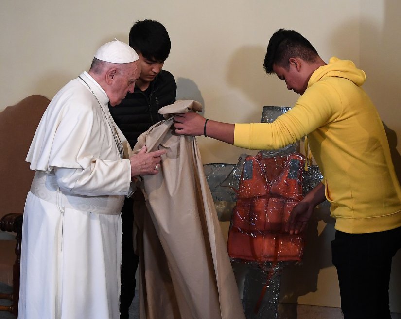 «Θέλησα να δείξω αυτό το σωσίβιο, πάνω σε σταυρό, διότι πρέπει να θυμόμαστε ότι επιβάλλεται να κρατάμε καλά ανοικτά τα μάτια μας και την καρδιά μας και να θυμούνται όλοι την υποχρέωση να σώζουν κάθε ανθρώπινη ζωή, μια ηθική υποχρέωση η οποία ενώνει πιστούς και μη», υπογράμμισε με έμφαση ο Φραγκίσκος.