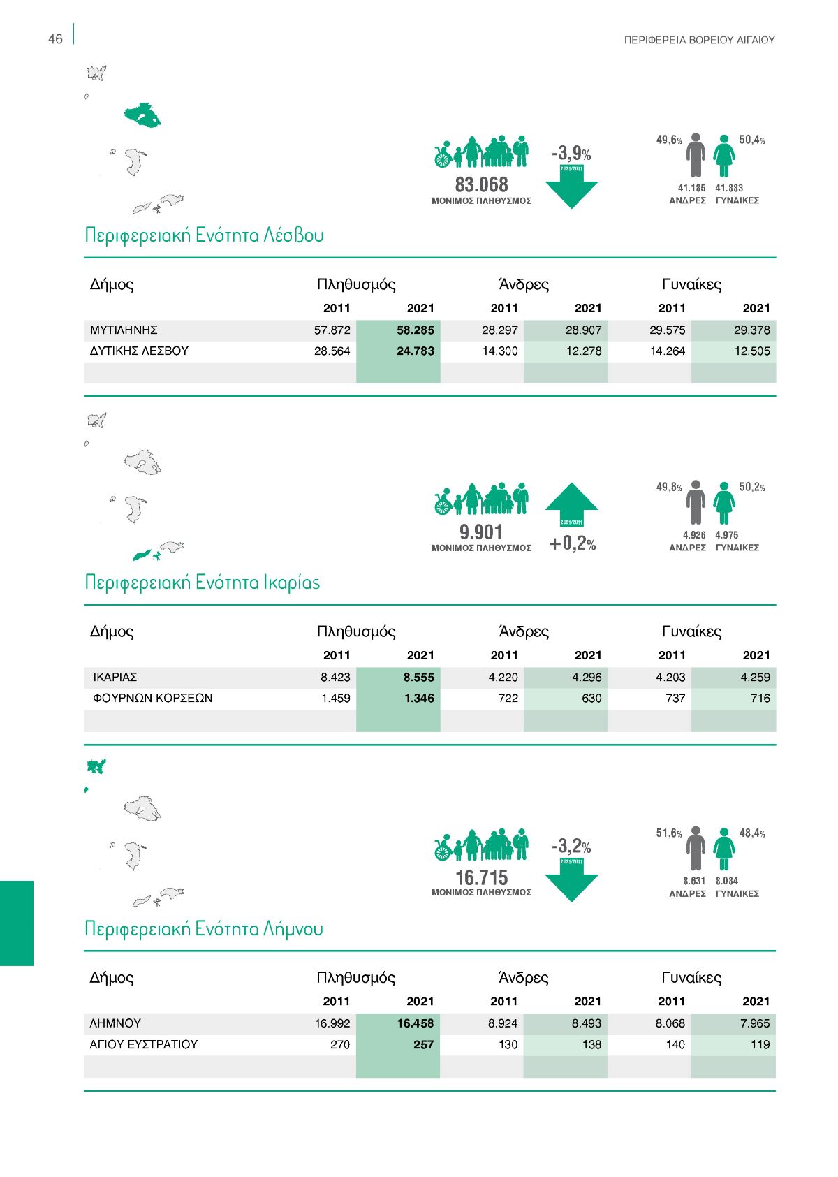 Σε ότι αφορά στο Βόρειο Αιγαίο ο μόνιμος πληθυσμός ανέρχεται σε 194.136 άτομα και συγκεκριμένα σε 97.178 άνδρες και 96.958 γυναίκες, αριθμός μειωμένος κατά 5.095 σε σχέση με την απογραφή του 2011.