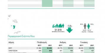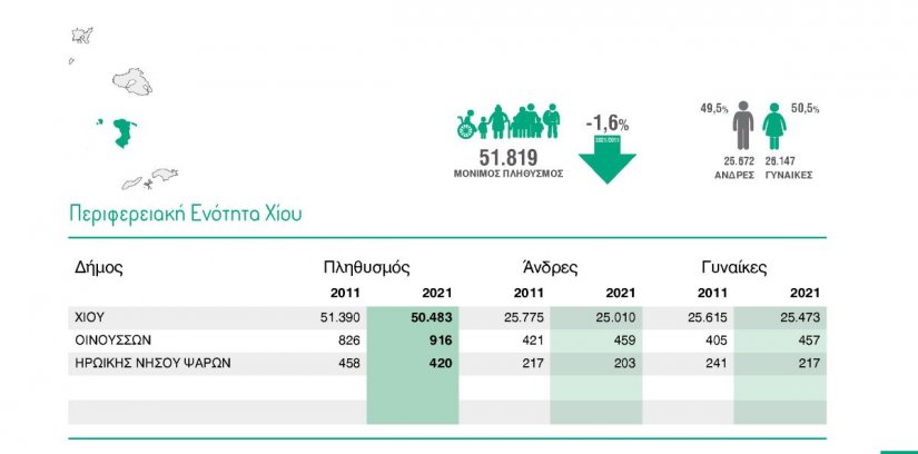 Αναλυτικά τα στοιχεία του 2011 παρουσιάζουν στο νησί της Χίου 51.390 άτομα και το 2021 50.483. Στις Οινούσσες 826 άτομα το 2011 και 916 το 2021 και τα Ψαρά 458 άτομα το 2011 και 420 το 2021.