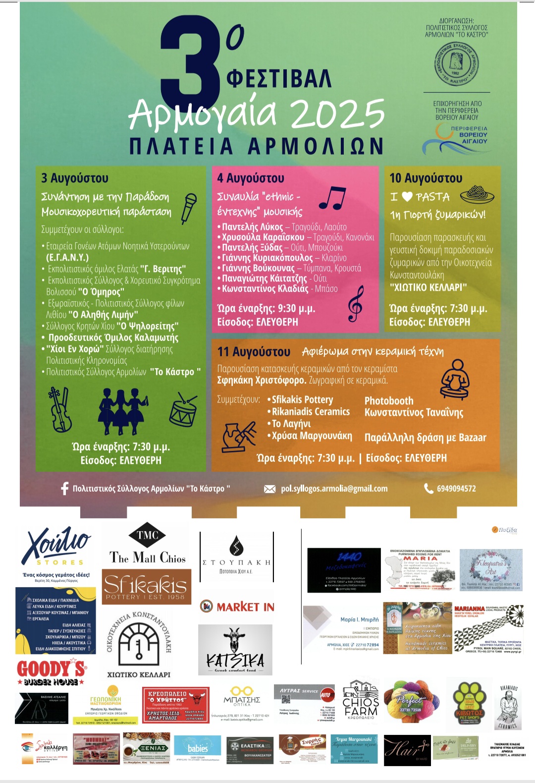 Το φεστιβάλ στ' Αρμόλια επιχορηγείται από την Περιφέρεια Βορείου Αιγαίου ιδιώτες χορηγούς.