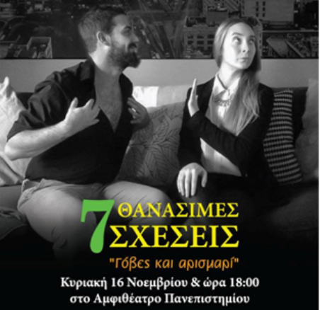 Φέτος, με ελάχιστα αλλαγμένο θέμα, θα μας παρουσιάσουν τις... 7 Θανάσιμες Σχέσεις! Εφτά διαφορετικοί συνδυασμοί ζευγαριών και εφτά ξεκαρδιστικές ιστορίες! Αυτή την Κυριακή στις 6 μ.μ. στο Αμφιθέατρο του Πανεπιστημίου Αιγαίου θα δείτε το πρώτο ζευγάρι...