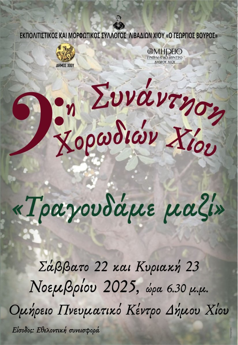 Ο Εκπολιτιστικός και Μορφωτικός Σύλλογος Λιβαδίων Χίου «Ο ΓΕΩΡΓΙΟΣ ΒΟΥΡΟΣ» έχει αναλάβει τη διοργάνωση της 9ης Συνάντησης Χορωδιών της Χίου, η οποία θα πραγματοποιηθεί το Σάββατο 22 και την Κυριακή 23 Νοεμβρίου 2025 στις 6:30 μ.μ. στο Ομήρειο.