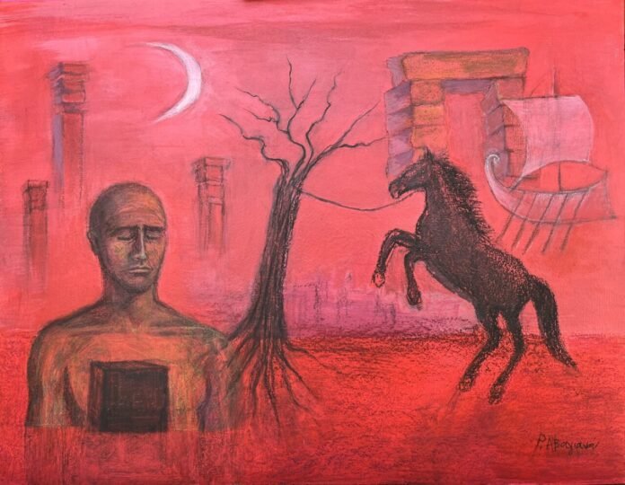 Όπως ενημερώνει ο Δ/ντής του Σχολείου, Σωτήρης Παραδείσης, στην έκθεση παρουσιάζονται έργα σύγχρονων Ελλήνων εικαστικών εμπνευσμένα από την αντιπολεμική τραγωδία Πέρσες του Αισχύλου, και κυρίως από τα δυσοίωνα όνειρα της Άτοσσας, βασίλισσας των Περσών και μητέρας του Ξέρξη, η οποία αγωνιά για την τύχη του στρατού και του γιού της που έχει εκστρατεύσει κατά των Ελλήνων παρασυρμένος από έπαρση και αλαζονεία.