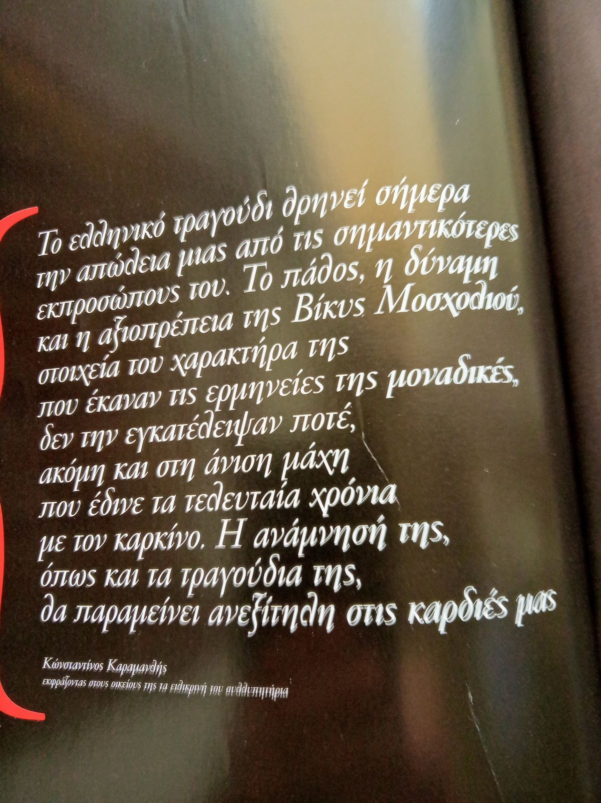 Η μεγάλη μας Αδυναμία ήταν καί είναι Νυν καί Αεί ή Αρχόντισσα τής καρδιάς και τής ψυχής ή δωρική φωνή τού πάθους και τής φωτιάς τού θάρρους και τής γενναιότητας, η ερωτική καί ανατρεπτική, η αρρενωπή δυνατή καί ευάλωτη θηλυκιά, αλλά και αντρίκεια στην αλήθεια και την δύναμη της, η φωνή της Βίκυς Μοσχολιού.
