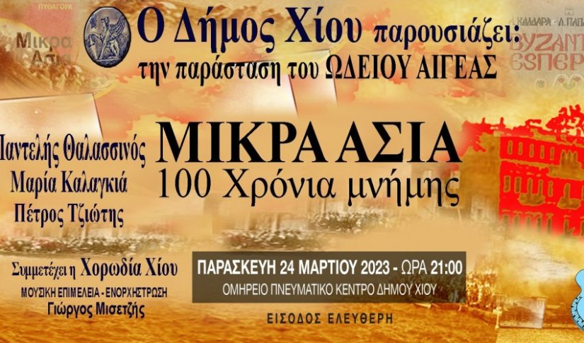 Ο Δήμος Χίου ενημερώνει ότι λόγω του μεγάλου ενδιαφέροντος του κοινού για το μουσικό αφιέρωμα «Μικρά Ασία» και «Βυζαντινός Εσπερινός» σε καλλιτεχνική επιμέλεια του Ωδείου «Αιγέας» την προσεχή Παρασκευή (24/3) αποφασίστηκε η πραγματοποίηση διπλής παρουσίασης της παράστασης.