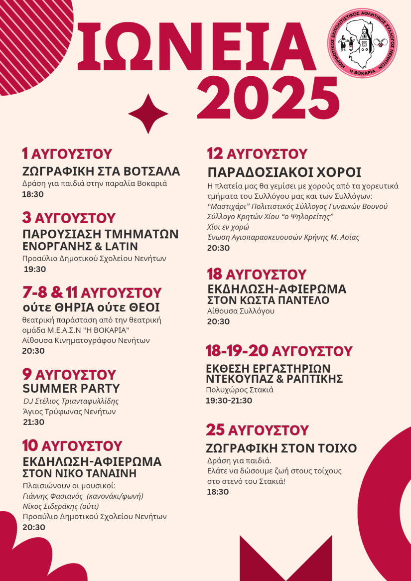 Το Διοικητικό Συμβούλιο του Μορφωτικού Εκπολιτιστικού και Αθλητικού Συλλόγου Νενήτων " Η Βοκαριά" διοργανώνει για άλλη μια φορά μια σειρά από ποικίλες εκδηλώσεις. Στις εκδηλώσεις περιλαμβάνονται θεατρικές παραστάσεις, εκθέσεις εργαστηρίων, δράσεις για παιδιά ,μουσικές παραστάσεις αλλά και εκδηλώσεις αφιερωμένες σε πρόσωπα που σηματοδότησαν με την προσφορά τους τη λειτουργία του συλλόγου.