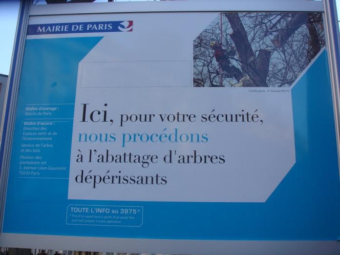 Η πρώτη φωτογραφία τραβήχτηκε στο Παρίσι πριν δύο χρόνια. Απεικονίζει μία πινακίδα του Δήμου Παρισίων σχετική με την κοπή κάποιων δέντρων στο Boulevard Voltaire η οποία διευκρινίζει μεταξύ άλλων: «Εδώ, για την ασφάλεια σας, θα προβούμε σε κοπή δέντρων… εργοδότης: Δήμος Παρισιού, εκτελεστής έργου: Διεύθυνση Πράσινων Χώρων & Περιβάλλοντος, Υπηρεσία Δέντρων & Δασών… πληροφορίες στο 3975, χρέωση αστικής μονάδας…». Πιο κάτω: «Είδος επέμβασης: Οι εξετάσεις για την κατάσταση των φυτών έδειξαν πως οι πλάτανοι πάσχουν από αθεράπευτη ασθένεια. Την Άνοιξη θα φυτευτούν νέοι πλάτανοι δέκα ετών προς αντικατάσταση των παλαιών…». Ακολουθούν μερικές συμβουλές διότι όπως υπογραμμίζει το κείμενο: «ένα δέντρο σε αστικό περιβάλλον είναι ιδιαίτερα ευαίσθητο».
