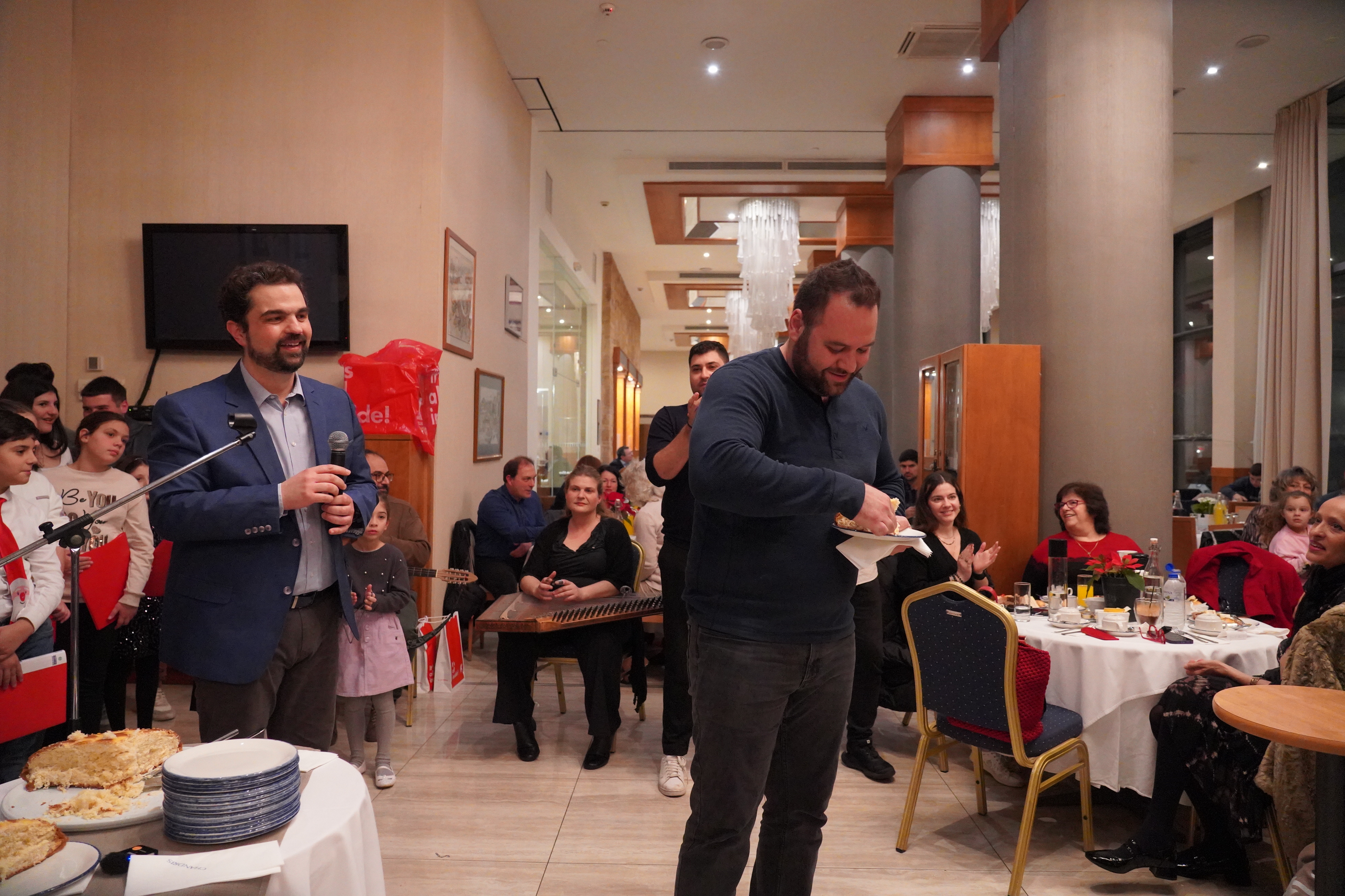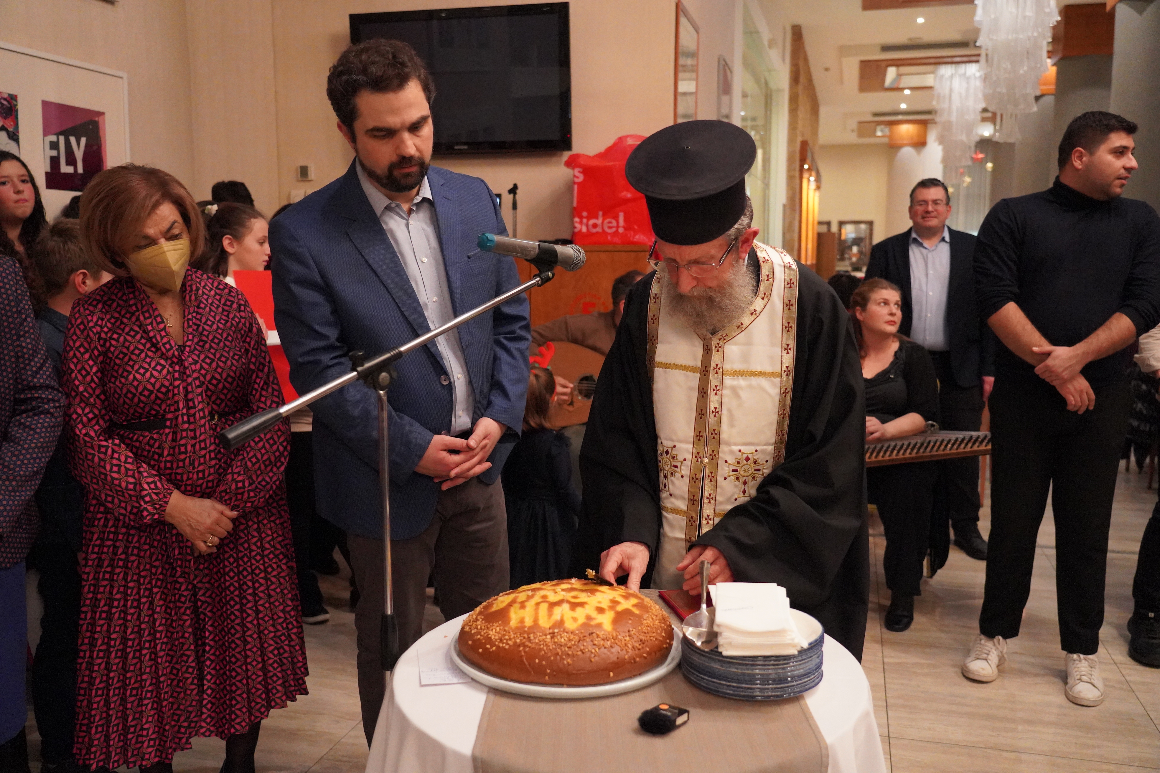 Η εκδήλωση ξεκίνησε με την ευλογία της πίτας του Ομίλου από τον Πατήρ Νικόλαο Μακρή και χαιρετισμό του προέδρου Κώστα Τριαντάφυλλου.