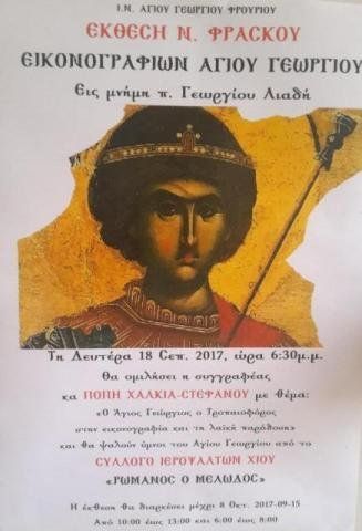 Εκθεση εικονογραφιών του Αγίου Γεωργίου, του Νικολή Φράσκου, θα πραγματοποιηθεί στον Ιερό ναό Αγίου Γεωργίου Φρουρίου, στη μνήμη του π. Γεώργιου Λιαδή, τη Δευτέρα 18 Σεπτεμβρίου στις 6:30μ.μ. Θα ομιλήσει η συγγραφέας Πόπη Χαλκιά - Στεφάνου, με θέμα: «Ο Άγιος Γεώργιος ο Τροπαιοφόρος στην εικονογραφία και τη λαϊκή παράδοση" Θα ψαλούν ύμνοι του Αγίου Γεωργίου από το Σύλλογο Ιεροψαλτών Χίου "Ρωμανός ο Μελωδός". Η έκθεση θα διαρκέσει μέχρι 8 Οκτωβρίου 10:00 π.μ. - 1.00 μ. και 6:00 - 8:00 μ.μ.