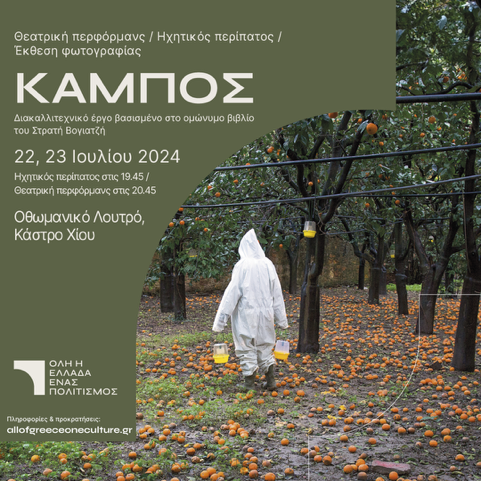 Στις 22 και 23 Ιουλίου ένας ηχητικός περίπατος, εμπνευσμένος από το βιβλίου του Στρατή Βογιατζή «Κάμπος», θα ενώνει το Οθωμανικό Λουτρό με τον Κάμπο της Χίου, δίνοντας στους θεατές τη δυνατότητα να συνθέσουν το δικό τους βιωματικό πορτρέτο. Ένα ηχητικό ταξίδι στο πολιτιστικό παρελθόν και παρόν του Κάμπου αλλά και της Χίου εν γένει. Μνήμες, ιστορίες, αφηγήσεις, πρόσωπα και θρύλοι ξεπηδούν από το βιβλίο του Στρατή Βογιατζή, συνθέτοντας έναν θυμικό οδικό χαρτή περιήγησης.