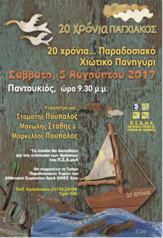 Τα 20 χρόνια του μας προσκαλεί να γιορτάσουμε μαζί ο Παγχιακός Σύλλογος Ατόμων με Αναπηρία το Σάββατο 05 Αυγούστου 2017 και ώρα 09:30 το βράδυ, στο γραφικό λιμανάκι του Παντουκιούς, με την ορχήστρα του Μαρκέλλου και Σταματίου Πούπαλου.