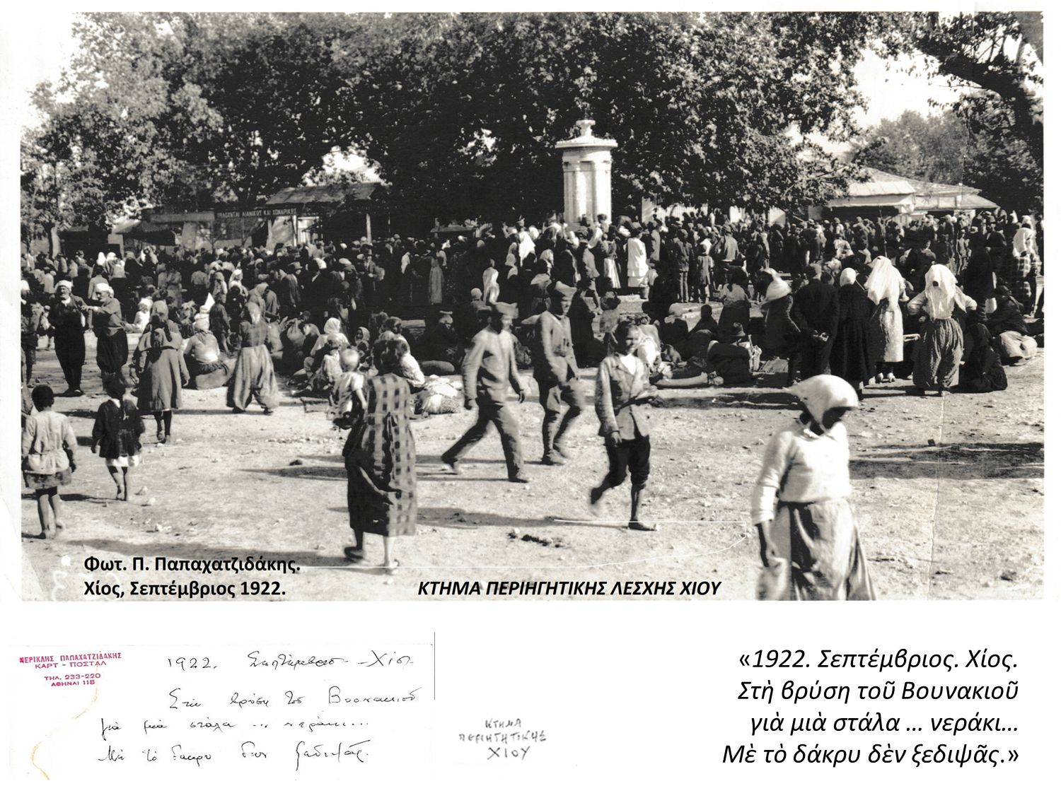 Πριν 100 χρόνια, μετά την κατάρρευση του ελληνικού μετώπου στη Μικρά Ασία χιλιάδες πρόσφυγες κατέφταναν στην κοντινή Χίο με κάθε πλεούμενο. Τις πρώτες δραματικές μέρες τους στο νησί απαθανάτισε με το φακό του ο Περικλής Παπαχατζιδάκης, πρόσφυγας και ο ίδιος στη Χίο από το 1914, όταν εννιάχρονος έφτασε από την Κάτω Παναγιά με τον πρώτο διωγμό. Από τις μεγάλες μορφές του μικρασιατικού κόσμου, πνεύμα ανήσυχο, προικισμένο με πολλά τάλαντα και αρετές, υπήρξε εξαίρετος καλλιτέχνης φωτογράφος, δεινός φυσιολάτρης οδοιπόρος, αθλητής, πρόσκοπος, συγγραφέας, άοκνος κοινωνικός εργάτης.