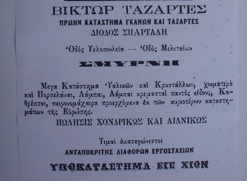 Στους εμπορικούς καταλόγους της Σμύρνης των ετών 1893, 1894 και 1895 εμφανίζονται μεταξύ άλλων οι Villeroy et Boch, ήδη μέτοχοι της Κεραμοποιίας της Sarreguemines από το 1838, ο Victor Tazartes ο οποίος έχει υποκατάστημα στη Χίο, καθώς επίσης και οι Γιάνναρος, Γεωργίου, Διμίτογλου, Ζαλίδης, Ιωαννίδης, Κρίτσας, Κωνσταντινίδης, Λιγόρος, Μαϊδώνης, Μαργετίδης, Μαρκόπουλος, Oppitz, Παπαδόπουλος και Στεφανίδης, Παπανικολής, Παπαπέτρος, Πεσάρος, Πούλος, Ρούσος, Τσακίρογλου, Τσουρουκτσόγλου, Χαστάογλου και Helzel. Τα περισσότερα καταστήματα βρίσκονται στην οδό Υαλοπωλείων.
